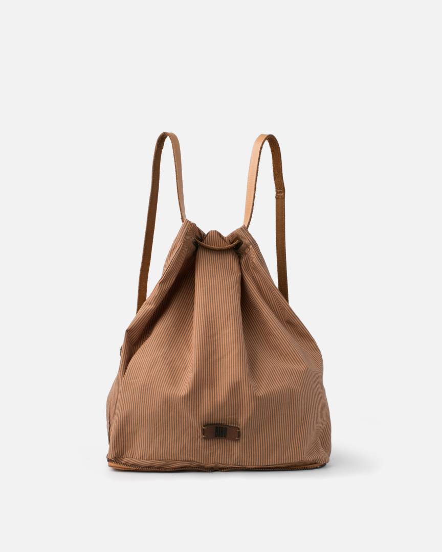 Adjustable leather handles and leather bottom with zipper closure, which allows the backpack to be folded and closed.