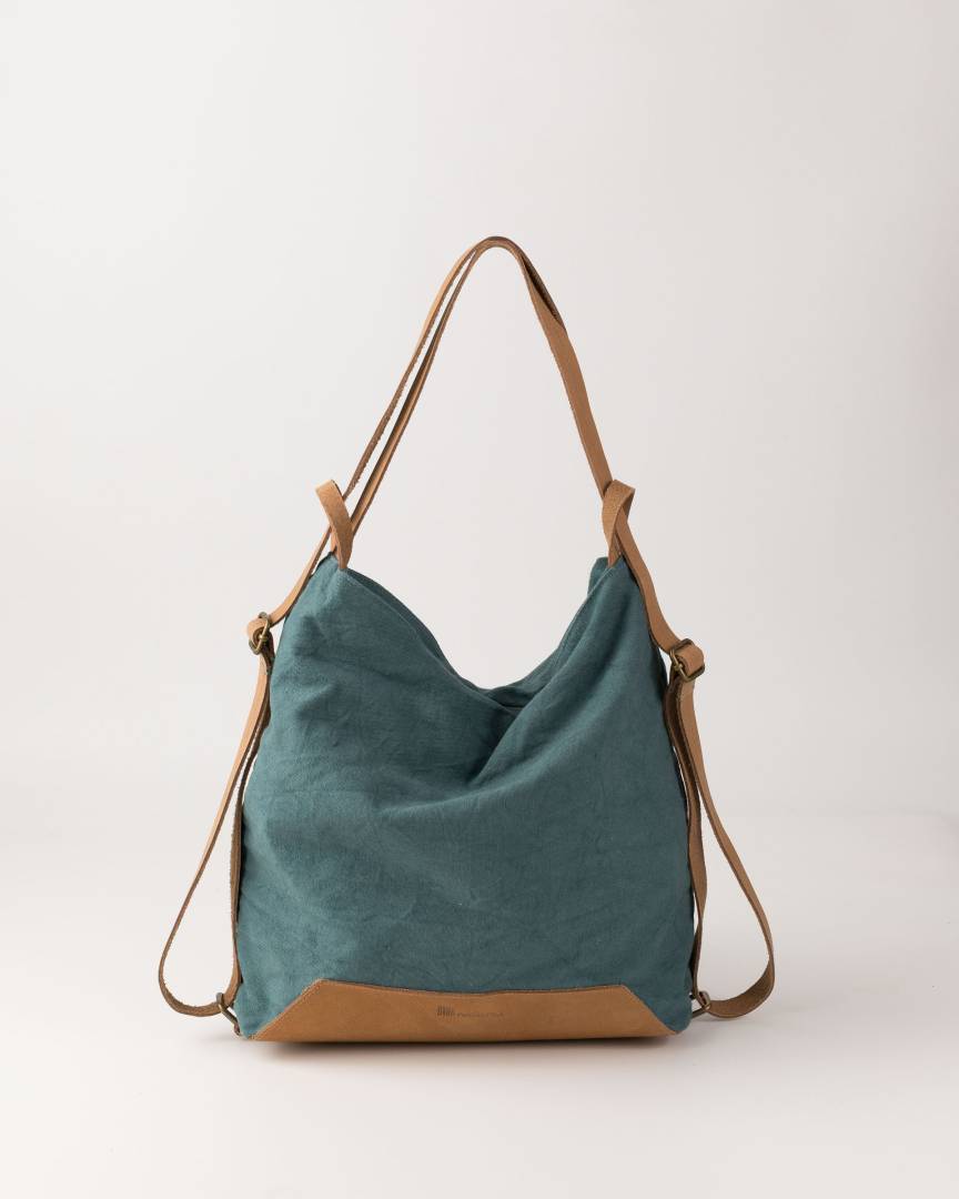 DESCRIPTION Recycled cotton backpack, convertible into a hobo bag, adjustable leather handles, external and internal pockets, zip closure, and cotton lining.