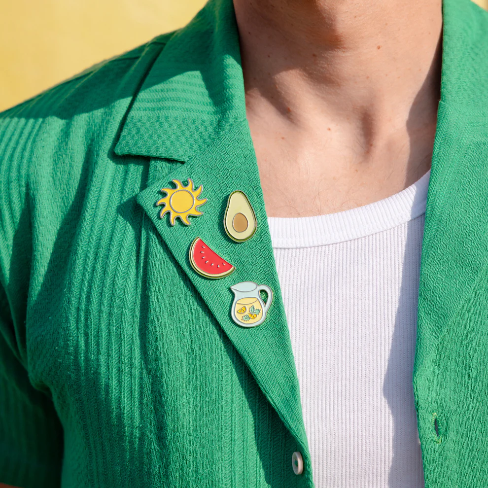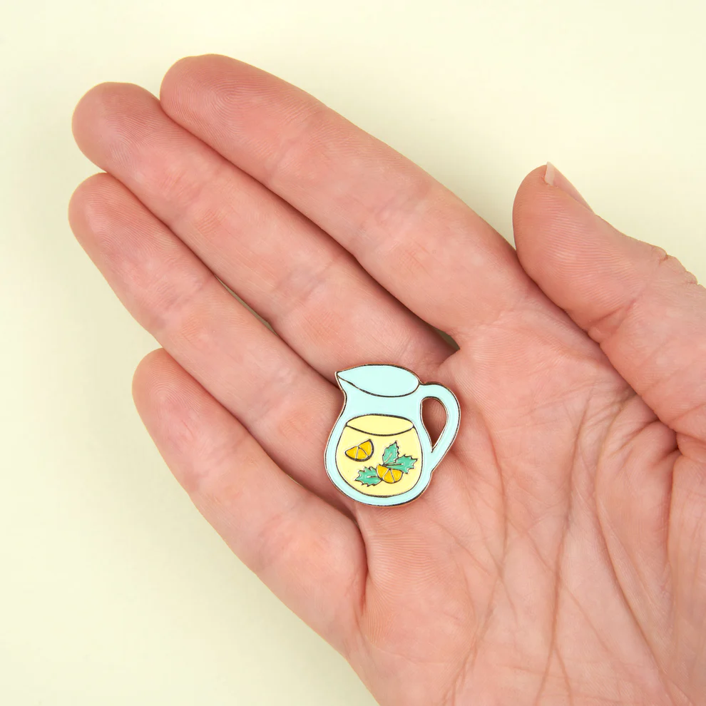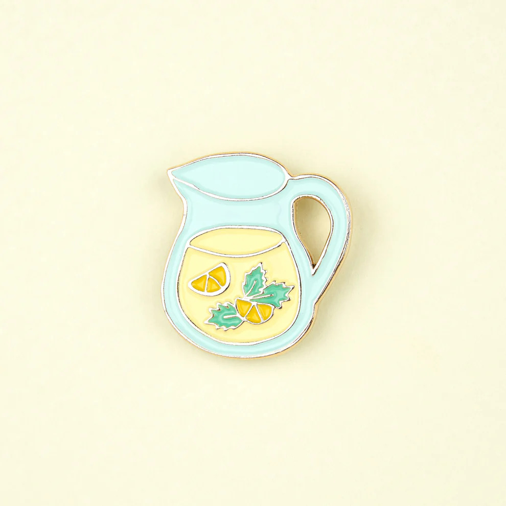 For a touch of freshness on our jacket, we pin the cutest lemonade pin: a perfectly iced carafe, rich with lemon and fresh mint from the market. Would you like another glass?
