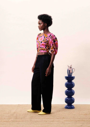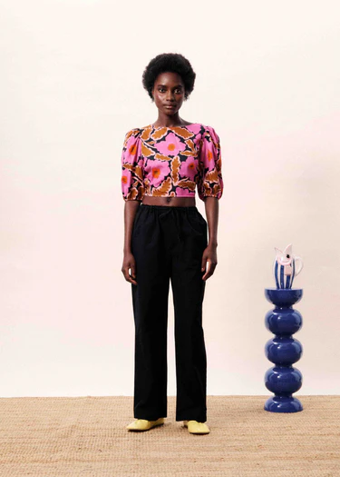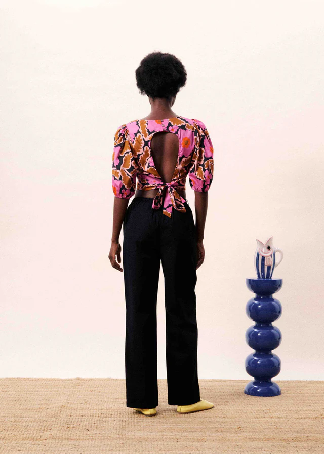 Floral print blouse with puff sleeves and a tie waist.