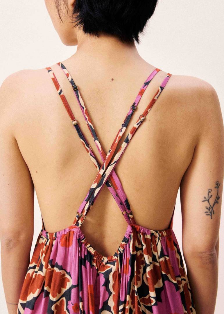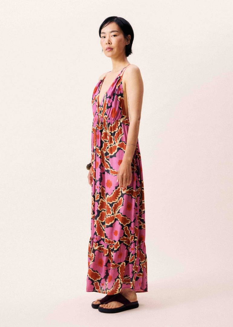 Long dress with straps in a pink and terracotta floral print.