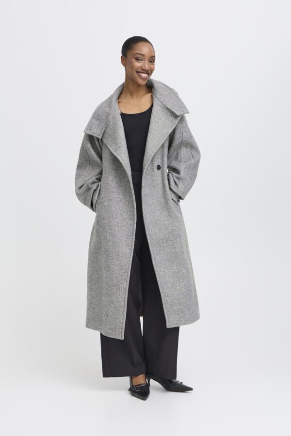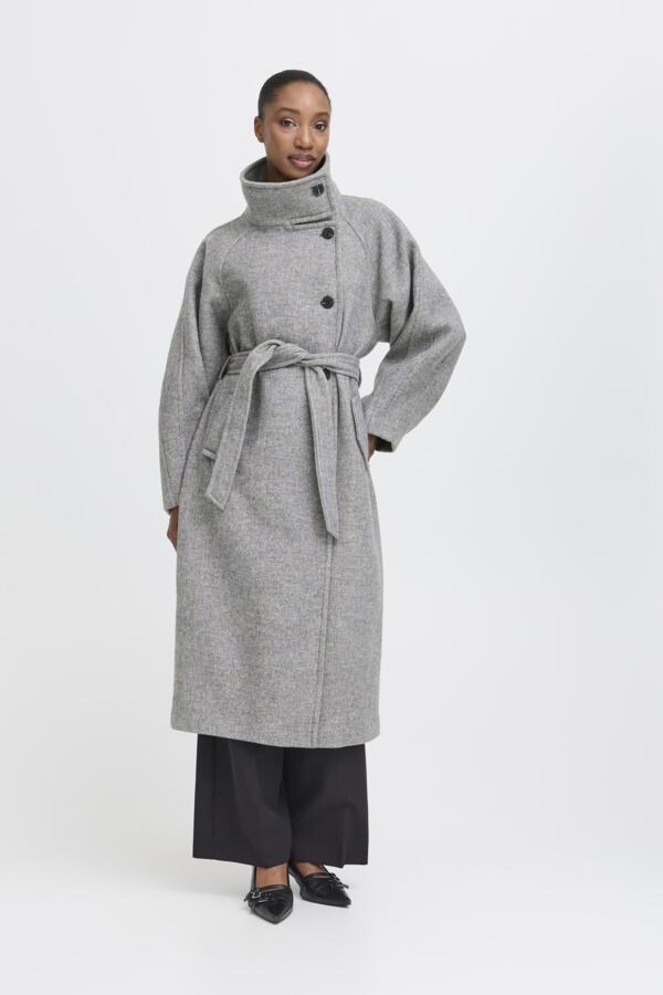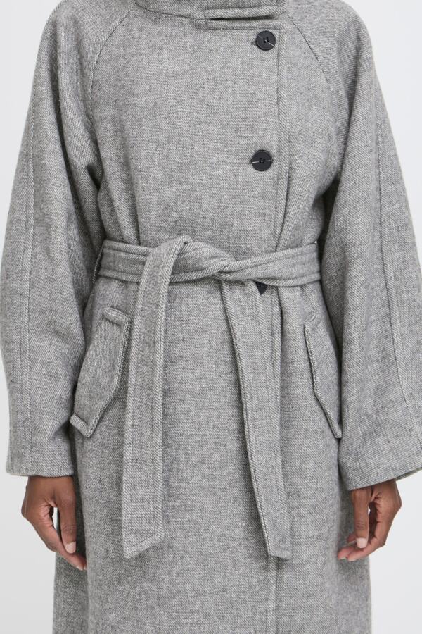 Long belted coat for women designed with a relaxed fit, high neckline, wide lapels, and buttoned closure. Comfortable silhouette, ideal for versatile wear in formal or casual settings.