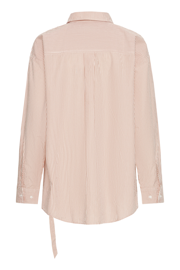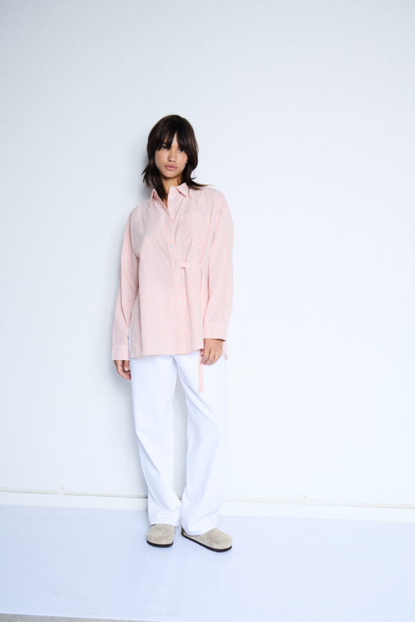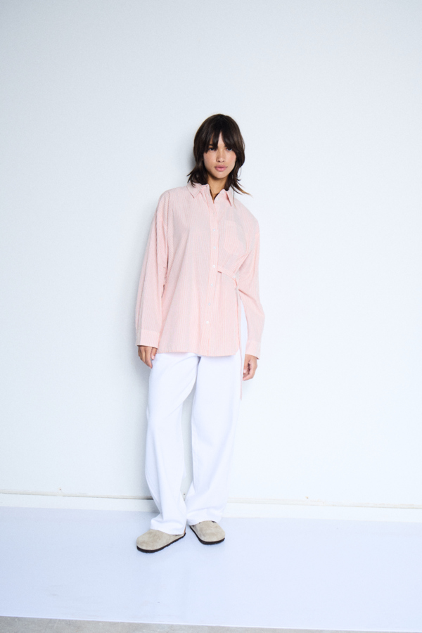 Striped shirt with a relaxed silhouette, classic collar, button front, long sleeves and single chest pocket. Unique waist tie detail adds a modern twist to this crisp, smooth-finish shirt style.