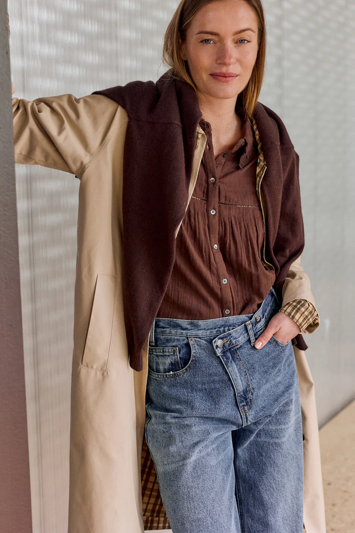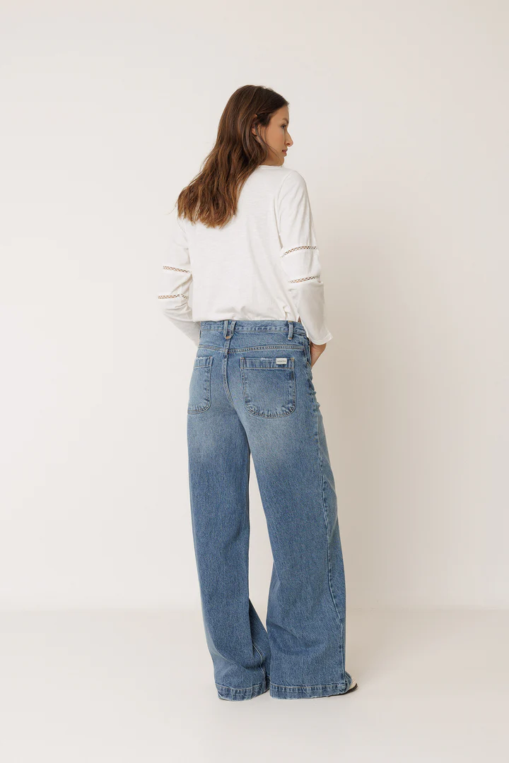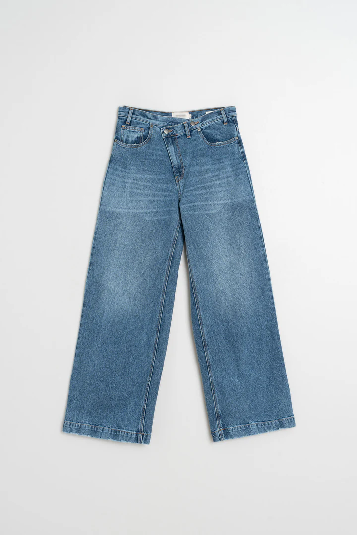 A wide-leg denim pant with a crossed waistband. A comfortable plant with a twist, giving personality to any look.