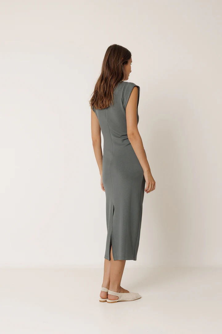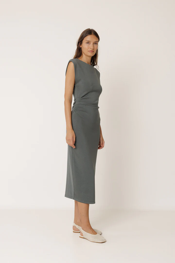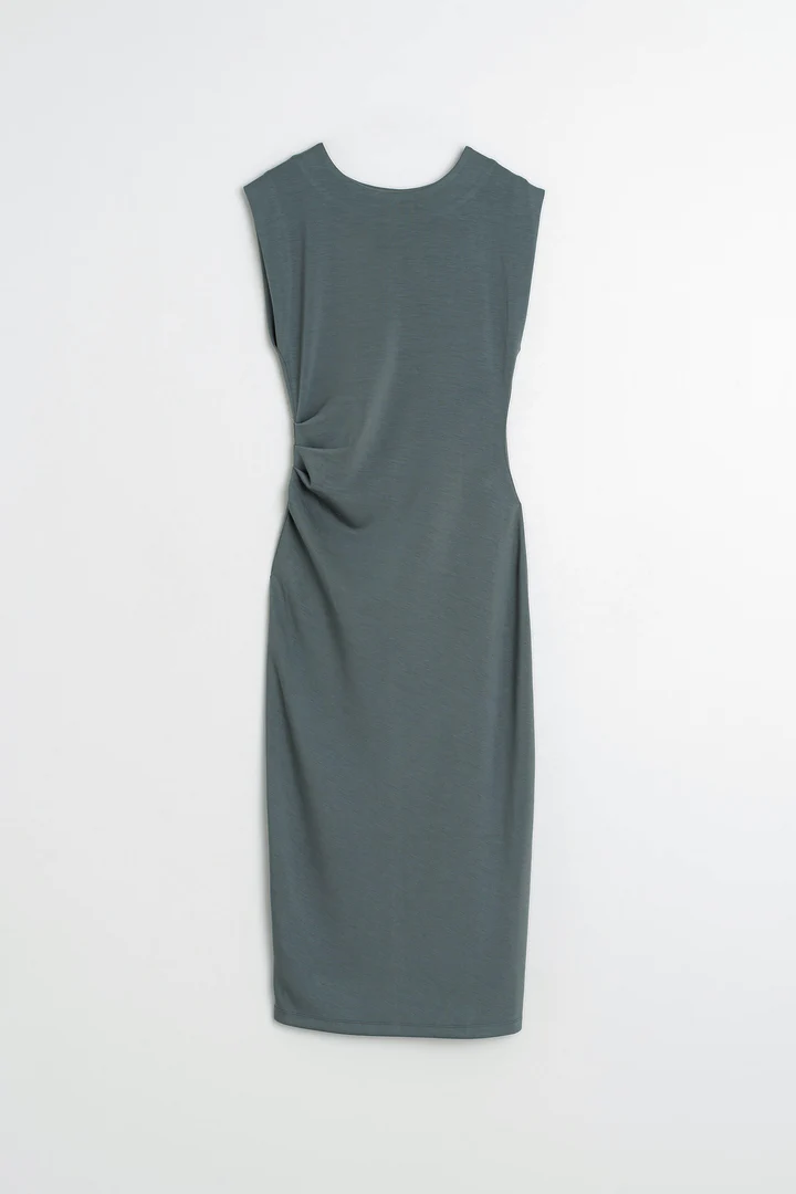 A long dress made in flowy fabric. It has a crewneck, slightly dropped shoulder and back slit. It’s one of the most sophisticated dresses in our collection, thanks to the pleating detail at the waist.