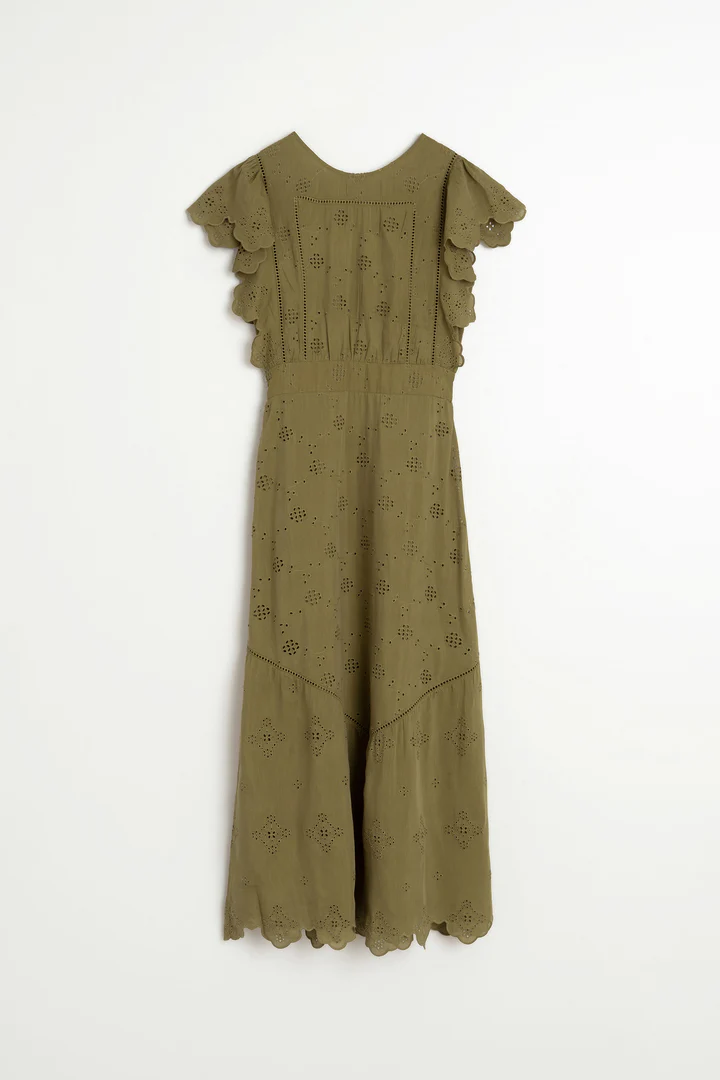 This precious maxi dress in voile cotton fabric features Schiffli embroidery, has a cut at the waist, plus a wavy, scalloped finish on the sleeves and bottom hem.