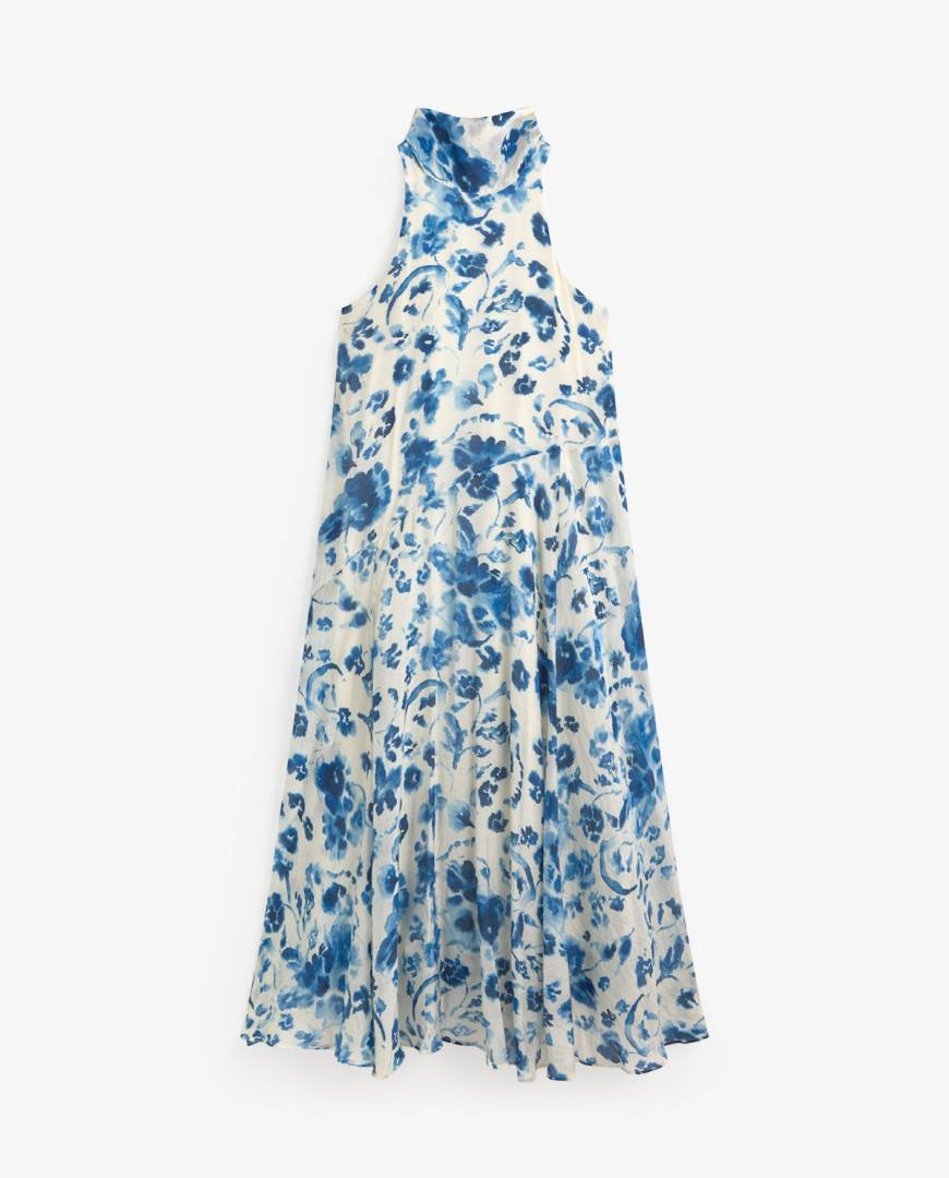 Flared cut with halter neck and multi-way foulard/bow Button fastening in back.